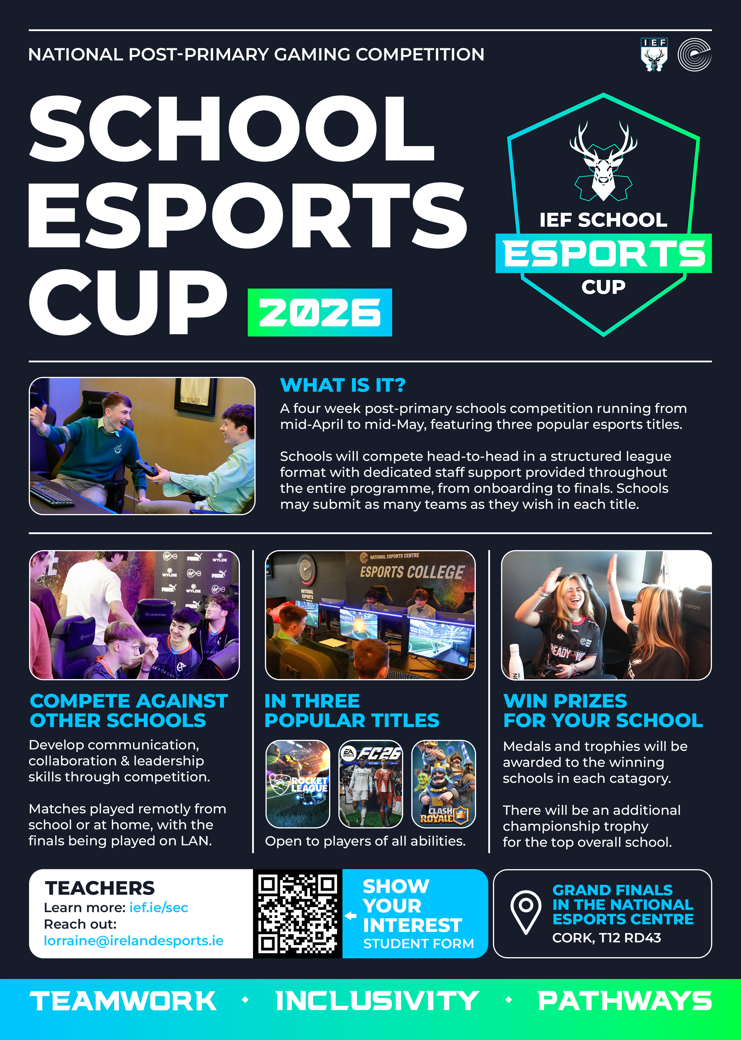 Ireland’s national post-primary school esports competition — giving students a structured, inclusive and safe way to represent their school, build teamwork, and compete on a national level.